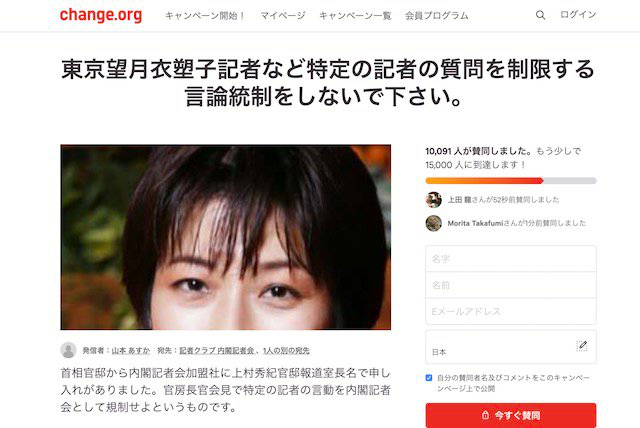 記者クラブの皆さんへ特定の記者の質問を制限しないで下さいと伝えるためにキャンペーンを始めました。よろしくお願いします。