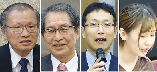 ▲(左から)日本基督教協議会総幹事のキム・ソンジェ牧師、佐野通夫教授、伊藤朝日太郎弁護士、リ・ユンリョン大学生。