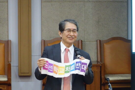 ▲ 『朝鮮学校差別反対』の横断幕を広げる佐野通夫教授。