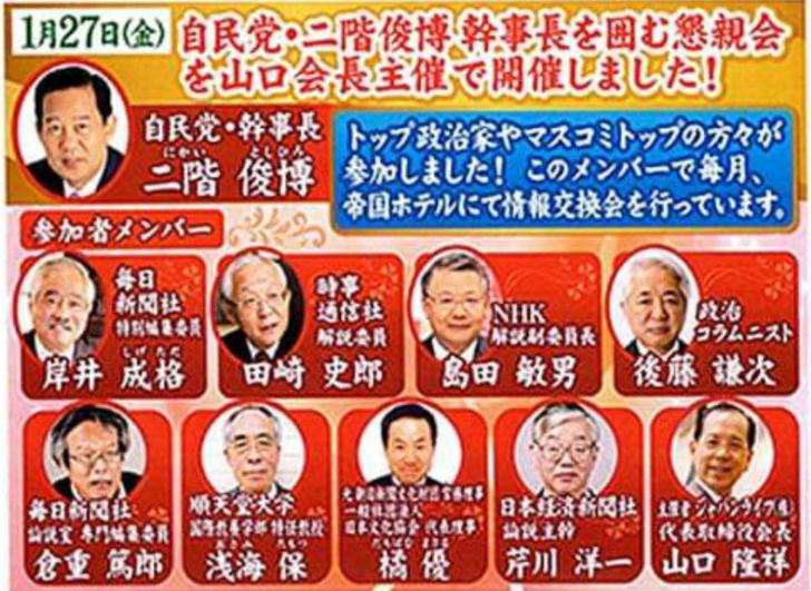 田崎史郎(時事通信)、島田敏男(NHK)、重倉篤郎(毎日新聞)、橘優(朝日新聞)らが