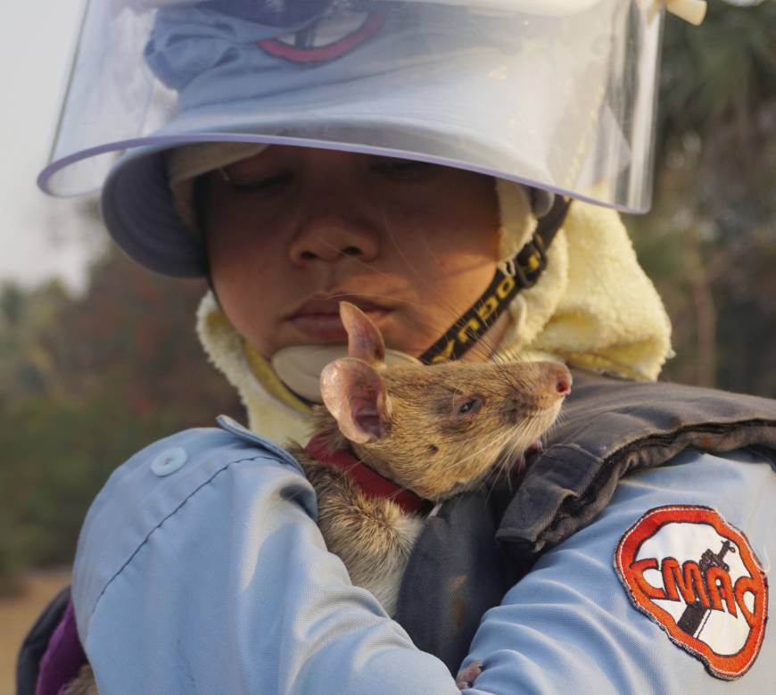 同国ではベルギーの市民団体APOPOが、嗅覚(きゅうかく)の鋭いネズミを「英雄ネズミ」として訓練し、地雷撤去に生かしてきた。地雷を爆発させずに動き回れる重さで、爆発物に含まれる化学物質のにおいをかぎ分けられるため、人間であれば最長4日かかるテニスコートほどの範囲の地雷捜索を約30分で終えられる。金属探知機と違って金属の破片に反応せず、地雷を見つけると、地面をひっかいて人間に知らせてくれる。