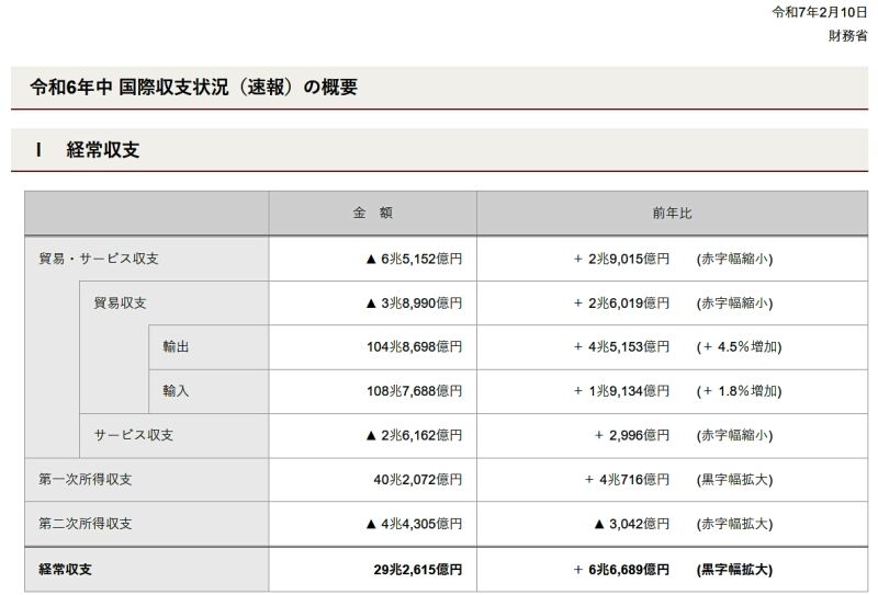 2025年02月10日に日本の財務省が2024年の経常収支のデータを公表しています。以下をご覧ください。