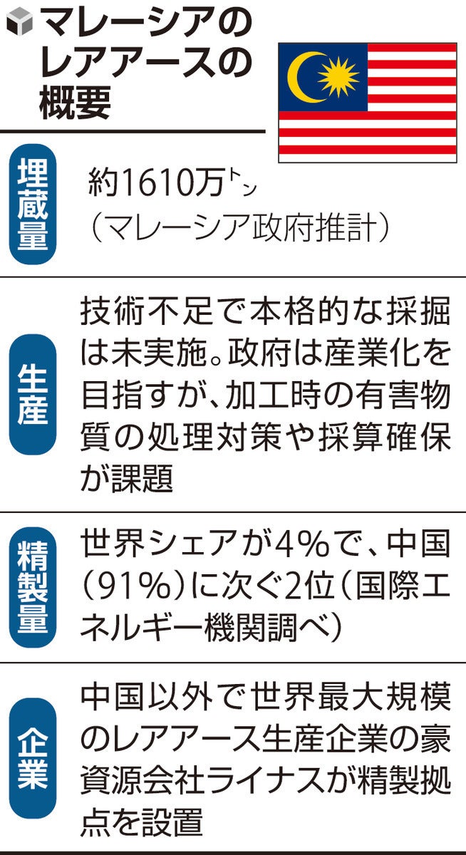 マレーシア政府の推計によると、国内のレアアース埋蔵量は約1610万トンに上る。米地質調査所(USGS)は、中国の埋蔵量が世界のほぼ半分の4400万トンと推定しており、単純比較はできないが、マレーシアには中国の3分の1程度のレアアースが眠っている可能性がある。