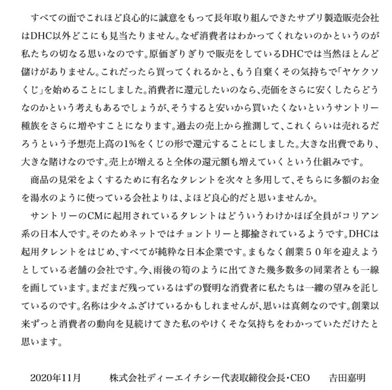 社名を冠したメディア企業の政治的スタンスは、一代でDHC本体を急成長させた吉田嘉明会長兼社長の意向が強く反映されている。DHCテレビが制作し、17年にTOKYOMXで放映された情報バラエティー番組『ニュース女子』は、BPO(放送倫理・番組向上機構)から「重大な放送倫理違反」を指摘された。在日韓国人で人権団体代表の辛淑玉(シン・スゴ)氏が組織的に参加者を動員し、沖縄で過激な米軍基地反対運動をあおっているという内容の番組は、東京高裁でも名誉毀損が認定されている。ルーツに対する差別もあり、判決内容は至極真っ当なものである。